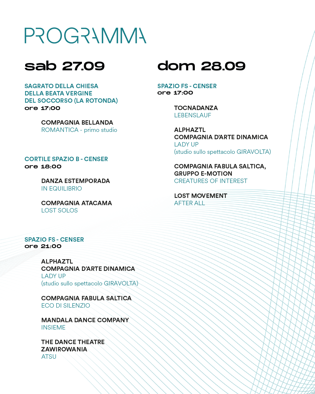Saranno ben dieci, le compagnie di danza che si alterneranno sui palcoscenici del festival, provenienti da tutta Italia ed una da Varsavia, per rappresentare, con undici performance tematiche differenti, tutto il panorama della ricerca coreografica contemporanea. Grande spazio è lasciato ai giovani coreografi emergenti, che hanno trovato nelle compagnie storiche, una progettualità attraverso cui potersi esprimere.