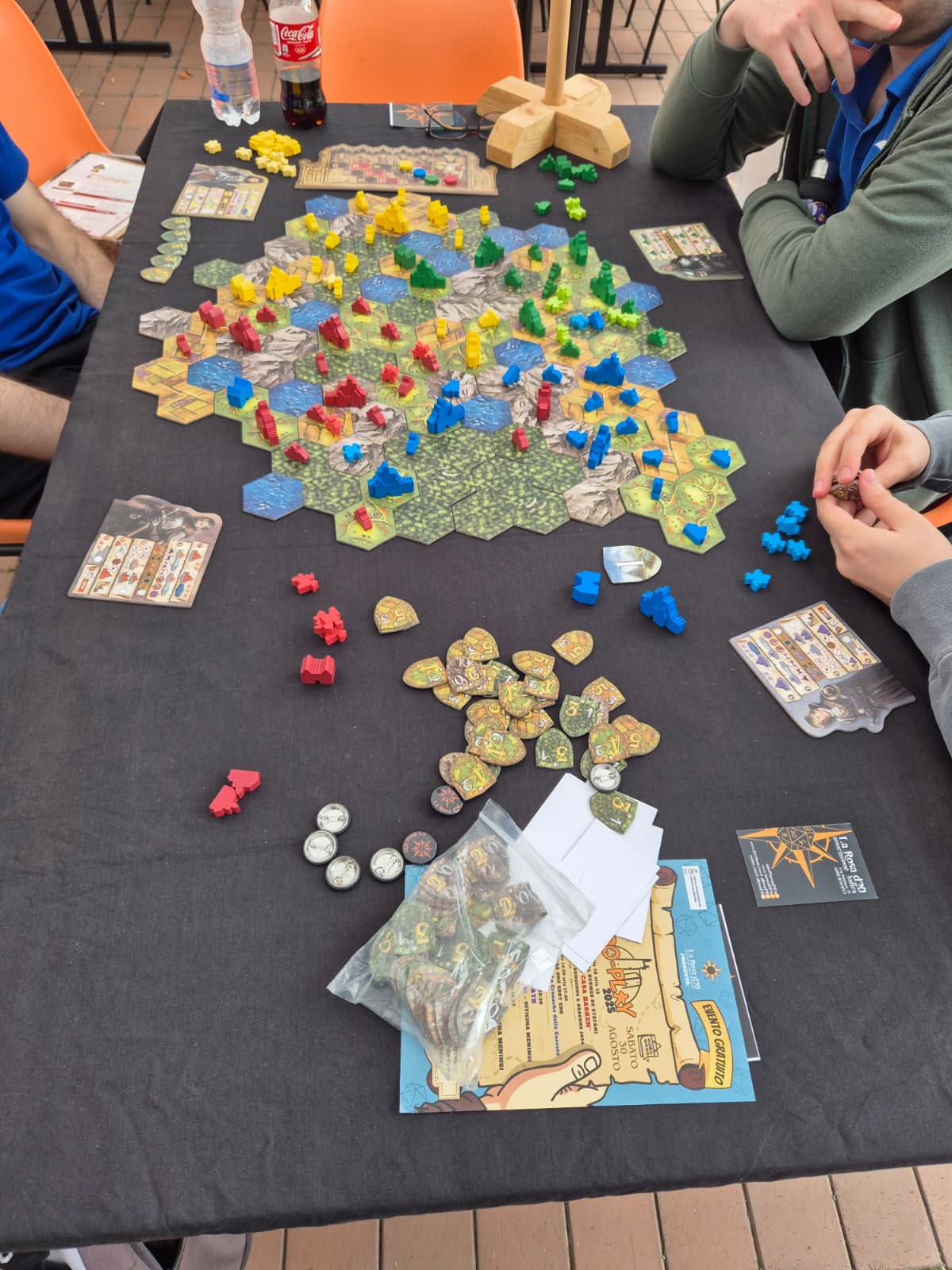 Nel primo pomeriggio la pioggia ci ha colti di sorpresa, ma non ci siamo fermati: i 9 gazebi sono stati riuniti per resistere al maltempo e nelle ore seguenti i nostri oltre 20 tavoli si sono riempiti di gioco e persone. C’è stata anche una bella varietà di pubblico giocante: famiglie, coppie, bambini, gruppi di amici, giocatori di lunga data e persone che si approcciavano al gioco di società per la prima volta, a dimostrazione che il gioco intelligente è adatto a tutti e c’è un gioco per tutti.