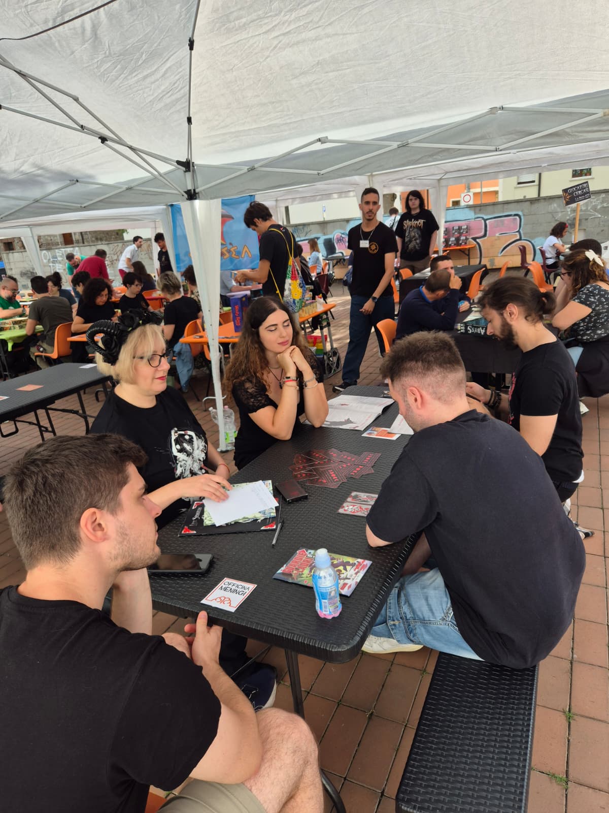La mattina è iniziata in maniera tranquilla, con i primi tavoli di gioco a scaldare l’atmosfera, ma soprattutto con il torneo memorial “Hermes De Stefani”, un momento intenso e partecipato per ricordare il nostro amico e socio fondatore scomparso prematuramente. Quattro squadre si sono affrontate a colpi di ingegno e interpretazione per risolvere “Il Mistero di Casa Harken”, avventura originale per Dungeons & Dragons edizione 2024 scritta da uno dei soci de La Rosa D20. Per capacità deduttive e brillante risoluzione ha vinto il torneo la squadra “Filoncini”, mentre Ilaria del Sentiero dei Draghi si è aggiudicata il titolo di miglior giocatore per le qualità interpretative.