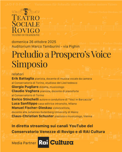 Dopo il successo delle masterclass di Erik Battaglia, pianista, docente di musica vocale da camera al Conservatorio di Torino, studioso del Lied tedesco, master organizzata da Fondazione Rovigo Cultura, Rovigo celebrerà questo anniversario con un altro momento di alto profilo culturale: domenica 26 ottobre alle ore 9.45, nell’Auditorium Marco Tamburini del Conservatorio “Francesco Venezze”, si terrà il Simposio internazionale “Preludio a Prospero’s Voice”, che vedrà la partecipazione di studiosi, musicologi e interpreti europei di rilievo, tra cui il celebre divulgatore musicale Enrico Stinchelli, autore e conduttore di “Voci in Barcaccia”, il programma cult di Rai Radio 3. L’evento sarà seguito in diretta streaming sul canale youtube di Rai Cultura, a conferma del valore nazionale e internazionale dell’iniziativa.