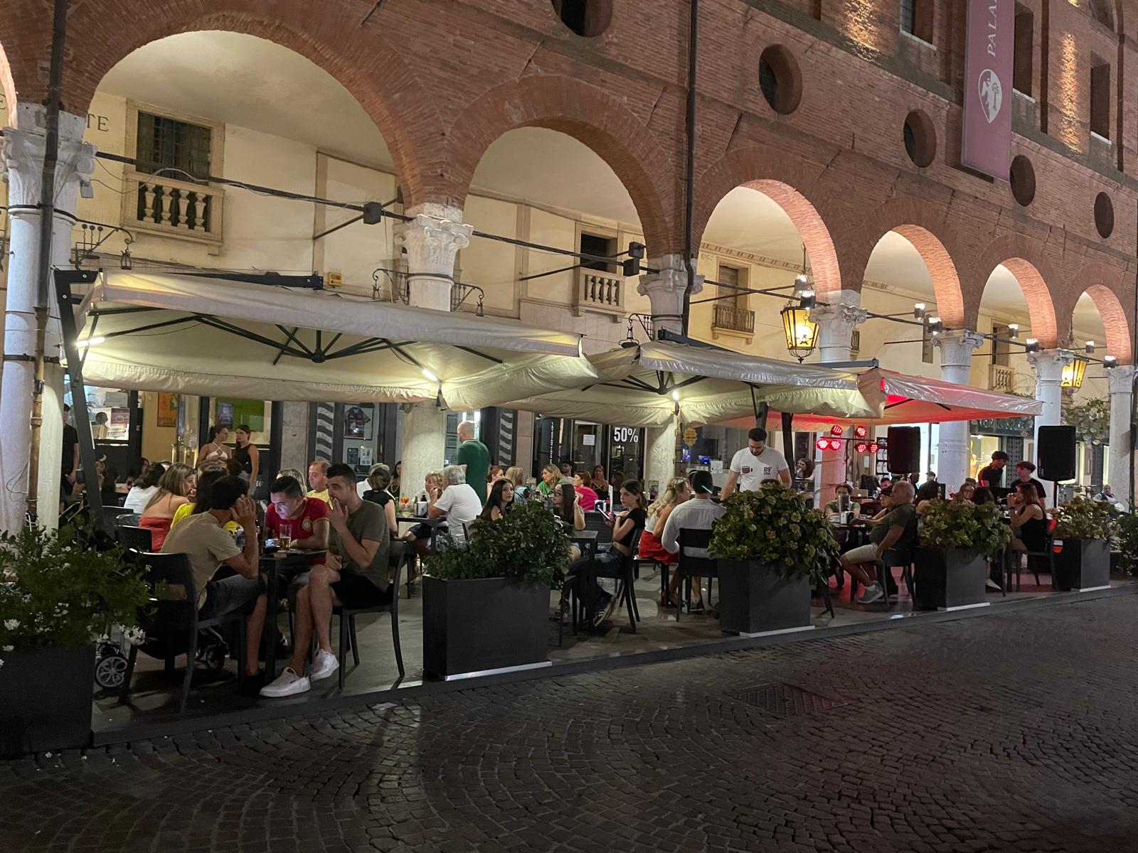 I portici del locale sono del prestigioso Palazzo Roverella che rendono la location del Caffè Molinari doppiamente unica e tappa importante in città dove godersi gli spettacoli di piazza nel periodo estivo.