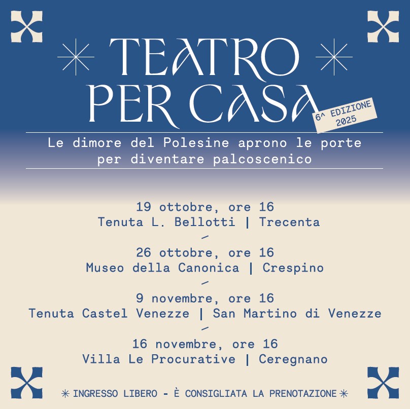 La rassegna proseguirà in altre tre dimore storiche individuate dalla Provincia di Rovigo. Domenica 26 ottobre “Teatro per casa” farà tappa a Villa Bevilacqua di Crespino, oggi sede del Museo della Canonica, dove alle 16.00 la Compagnia “El Tanbarelo” di Bellombra si esibirà in “Don Checo”, spettacolo firmato da Attilio Rovinelli e ambientato nella campagna degli anni ‘30. Due settimane dopo, domenica 9 novembre, il teatro amatoriale sarà protagonista nella scenografica Tenuta Castel Venezze di San Martino di Venezze: la Compagnia Teatro Nexus di Rovigo presenterà, sempre alle 16.00, la commedia “Hai Pensato a una storia?” di Barbara Chinaglia e Claudia Turolla, basata sulla vita della scrittrice britannica Mary Shelley. L’edizione 2025 di “Teatro per casa” si chiuderàdomenica 16 novembre a Ceregnano negli ampi spazi di Villa Le Procurative, dove alle 16.00 la Compagnia Fuori di Scena di Rovigo porterà “Candido, l'ottimista”, riproduzione teatrale liberamente tratta dal romanzo “Le Candide” di Voltaire.