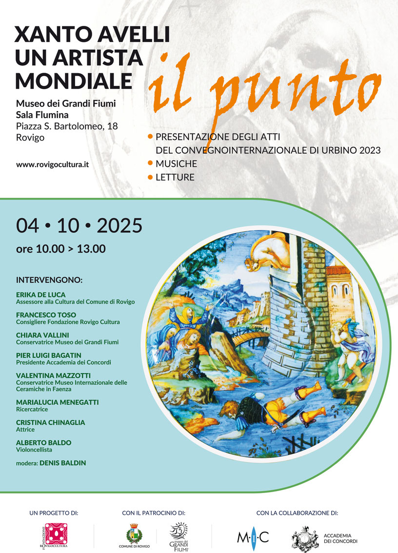 A quasi due anni dall’importante convegno internazionale svoltosi a Urbino, l’ambizioso progetto volto alla conoscenza e alla valorizzazione del grande artista rinascimentale rodigino torna nella sede, il Museo dei Grandi Fiumi, che lo aveva tenuto a battesimo e che conserva, nella Sezione Rinascimentale, l’unica sua opera presente nella provincia rodigina. Un’occasione, questa volta, per la presentazione della prestigiosa rivista “Faenza”, Bollettino del Museo Internazionale delle Ceramiche in Faenza, che ha dedicato, il n.2 dell’anno 2024, interamente agli Atti del convegno svoltosi nella città marchigiana che ha accolto i maggiori studiosi internazionali di ceramica rinascimentale. La presentazione degli Atti sono l’ultima attività prevista dal progetto “Xanto Avelli, un artista mondiale”, un progetto multi azione che, per la sua complessità e per l’elevato numero di Istituzioni coinvolte, ha richiesto un’organizzazione e una realizzazione pluriennale. Esso è costituito, infatti, da più azioni che possono essere raggruppate in tre grandi tematiche: ricerca scientifica, approfondimento didattico e valorizzazione di luoghi identitari.